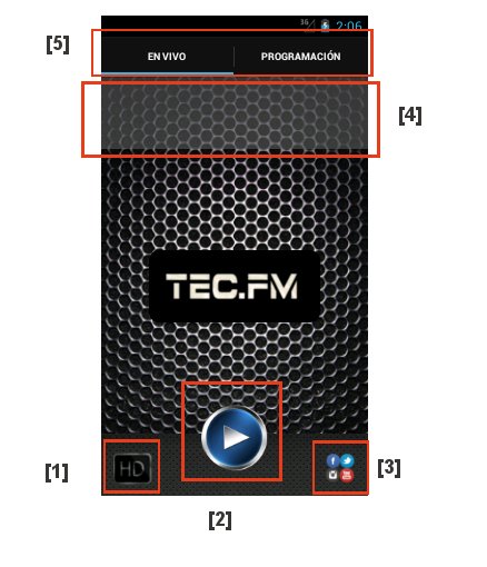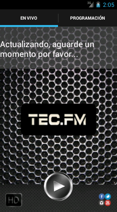 Cuando la app inicie lo primero que hara es sincronizarse con el servidor de Tec.Fm por lo que para poder usarla habra que esperar a que esto termine, no toma mas de 2 segundos por lo gral. Cuando esto termine el boton central cambiara a color Azul lo que significa que esta lista para usar, al presionarlo comenzara la reproduccion del streaming, como se observa en la sig. secuencia.