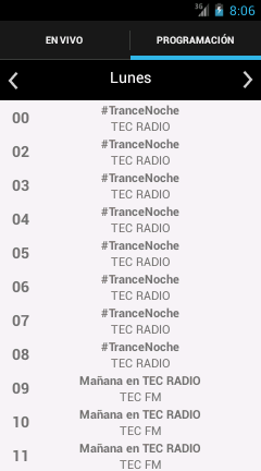 En esta seccion podras conocer el listado con la programacion de la radio, al clickear en las flechas cambiaras de dia.
